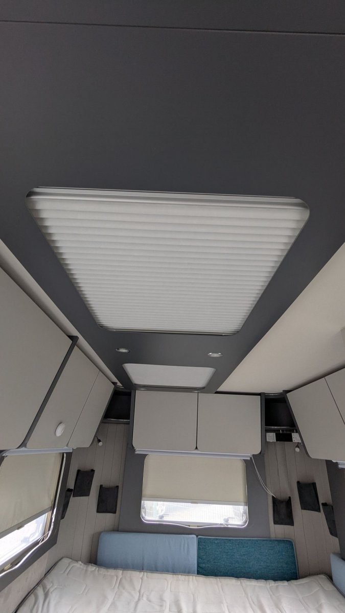 Zwei große, aufstellbare Dachfenster mit Verdunkelungs- und Fliegenschutzplissee